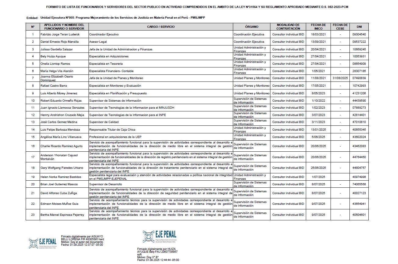 Normas y documentos FORMATO DE LISTA DE FUNCIONARIOS Y SERVIDORES DEL SECTOR PUBLICO EN ACTIVIDAD COMPRENDIDOS EN EL AMBITO DE LA LEY N°31564 Y SU REGLAMENTO APROBADO MEDIANTE D.S. 082-2023-PCM