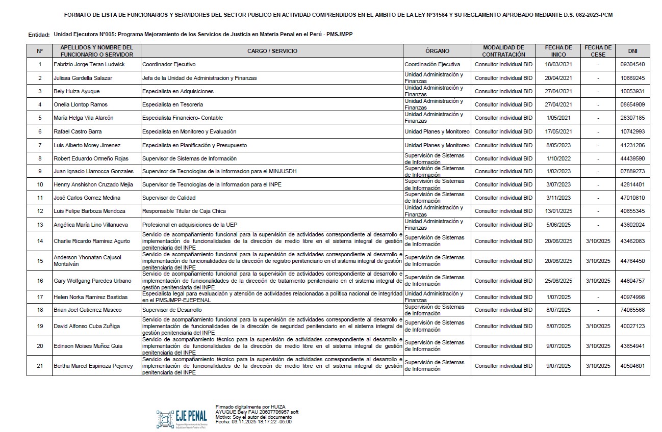 FORMATO DE LISTA DE FUNCIONARIOS Y SERVIDORES DEL SECTOR PUBLICO EN ACTIVIDAD COMPRENDIDOS EN EL AMBITO DE LA LEY N°31564 Y SU REGLAMENTO APROBADO MEDIANTE D.S. 082-2023-PCM – Noviembre 2025